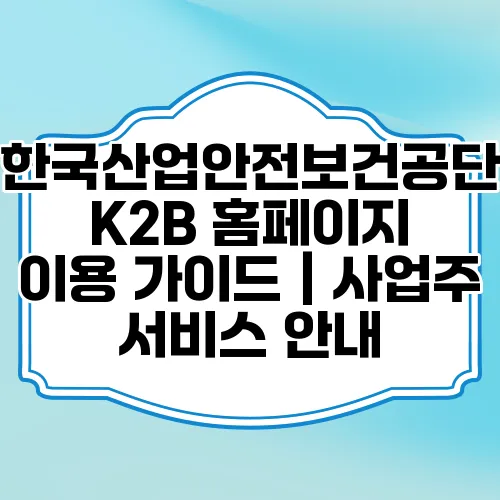 한국산업안전보건공단 K2B 홈페이지는 사업주와 근로자가 안전하고 건강한 사업장을 만들기 위해 필요한 다양한 정보를 제공하는 플랫폼입니다.